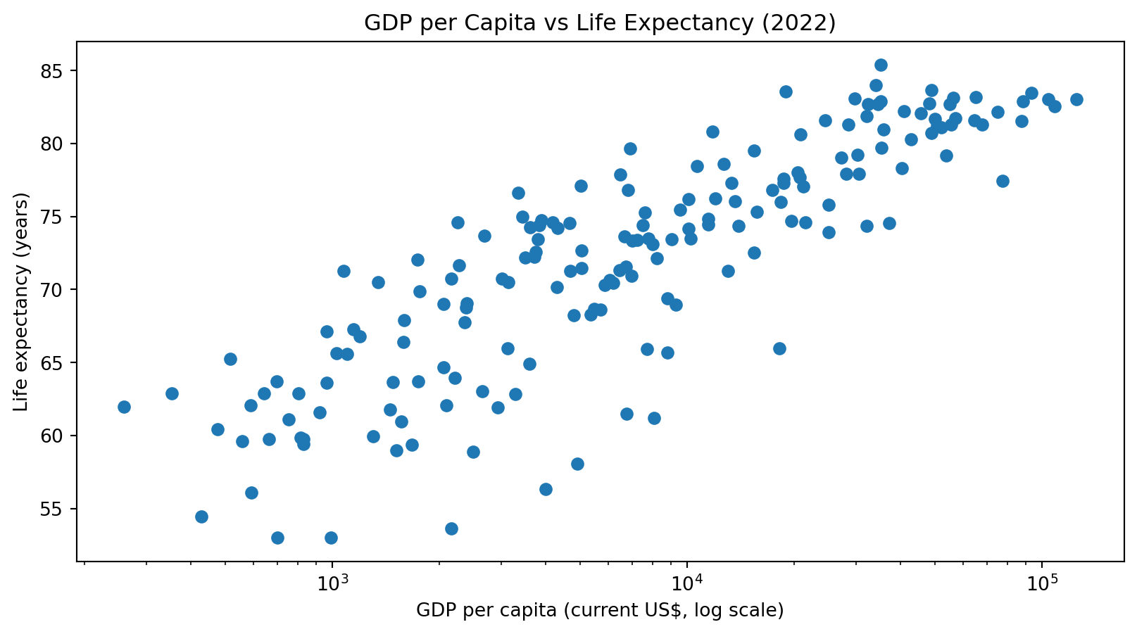 Many cross-country comparisons show that higher income tends to be associated with higher life expectancy. This is closely related to the classic “Preston curve” idea (Preston 1975).